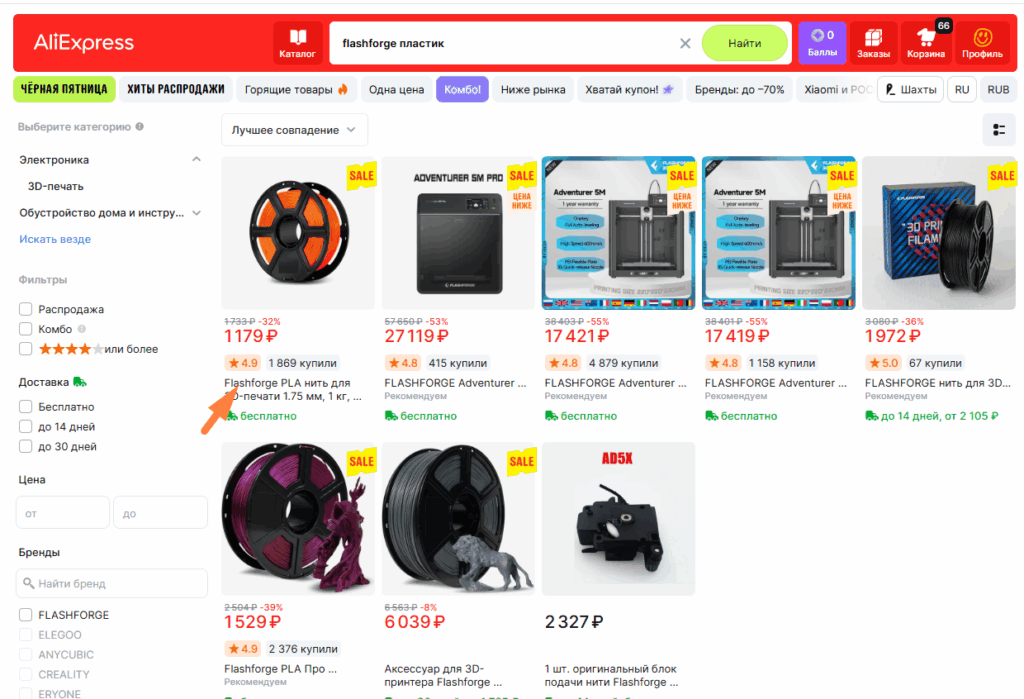 Если вы НЕ хотите заморачиваться вообще и печатать на настройках по умолчанию, то печатайте оригинальным пластиком FlashForge который продают на aliexpress. На данный момент он сильно подешевел и вполне приемлем. Зайдите в его магазин и там еще варианты будут, PLA, PETG можно брать. Искать по запросу «flashforge pla». Там же найдете комплектный жженый титан (синенький с блестками). Цена сильно плавает.
