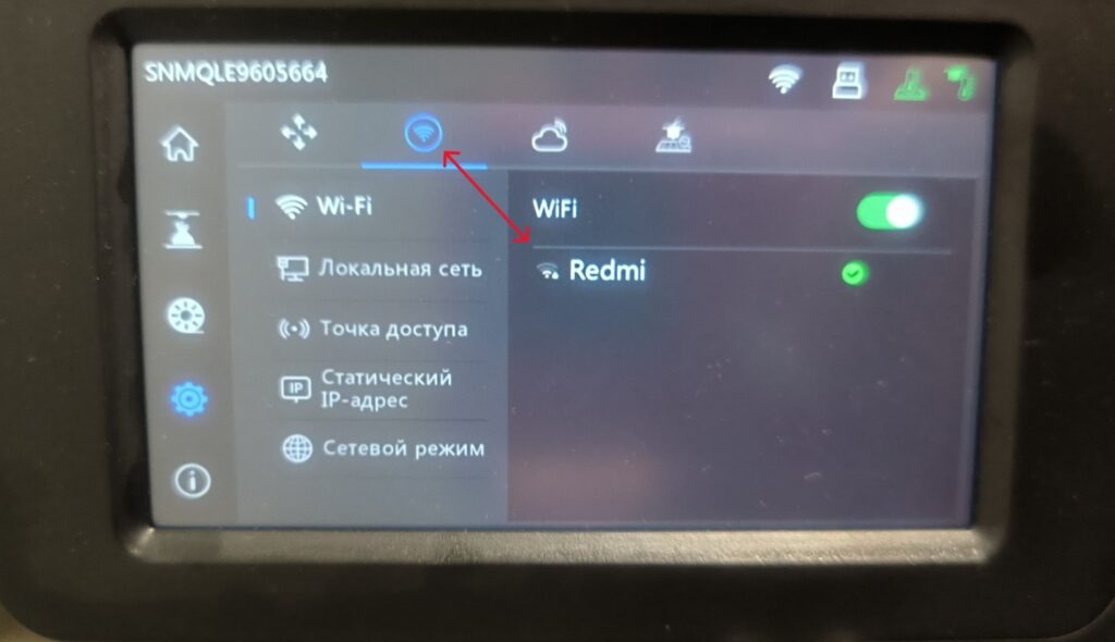 Переходим в настройки самого принтера, нажимаем шестеренку, и далее значек Wi-Fi. Включаем Wi-Fi ползунком и ищем свой домашний Wi-Fi. Важно, чтобы и принтер и компьютер с которого скидываются модели были на одном Wi-Fi роутере подключены.
