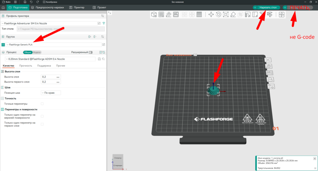 Выбираем пруток PLA, PETG или еще что-то, перетаскиваем STL модели на рабочий стол, нажимаем нарезать стол, далее чуть правее нажимаем кнопку «Печать» и соглашаемся на передачу.